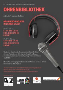 Am 20. und 21. Juli 2018 gibt es für junge Medienmacher in Mönchengladbach in der „Ohrenbibliothek 2018“ wieder was „auf die Ohren“. Die Stadtbibliothek startet ein Ferien-Special. Unter Anleitung des erfahrenden Hörfunkredakteurs Axel Tillmanns produzieren Kinder und Jugendliche im Alter von 10 und 14 Jahren Audio- und Videobeiträge  – packende Reportagen, interessante Interviews, spannende Podcasts und tolle Hörspiele –  und veröffentlichen sie im Netz – von Soundcloud über Youtube bis Whatsapp. Die angehenden Medienmacher lernen Schritt für Schritt, wie es geht: Umgang mit Sprache und ihrer Stimme, Aufnahme, digitale Bearbeitung. Außerdem blicken sie hinter die Kulissen ihrer Stadt und schauen im MINTO vorbei. Dort dürfen sie exklusiv hinter die Kulissen des Mönchengladbacher Shoppingcenters blicken und spannende Interviews mit den Verantwortlichen des MINTO führen.